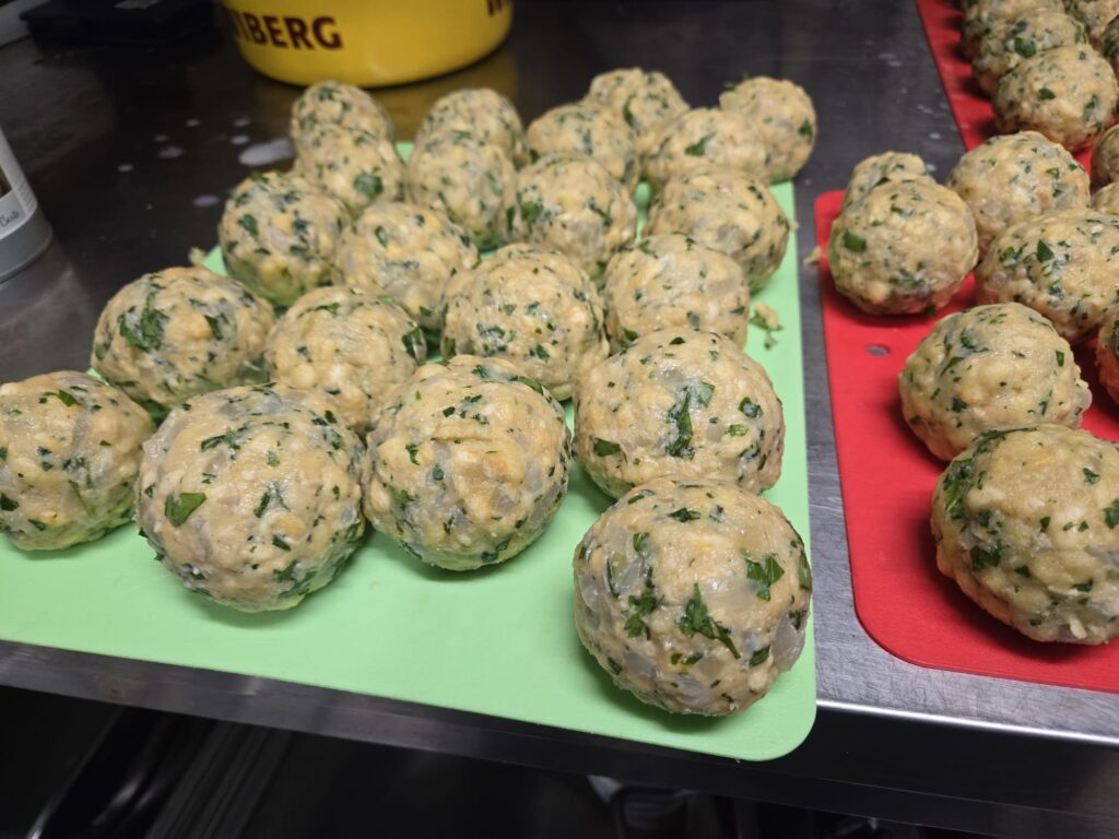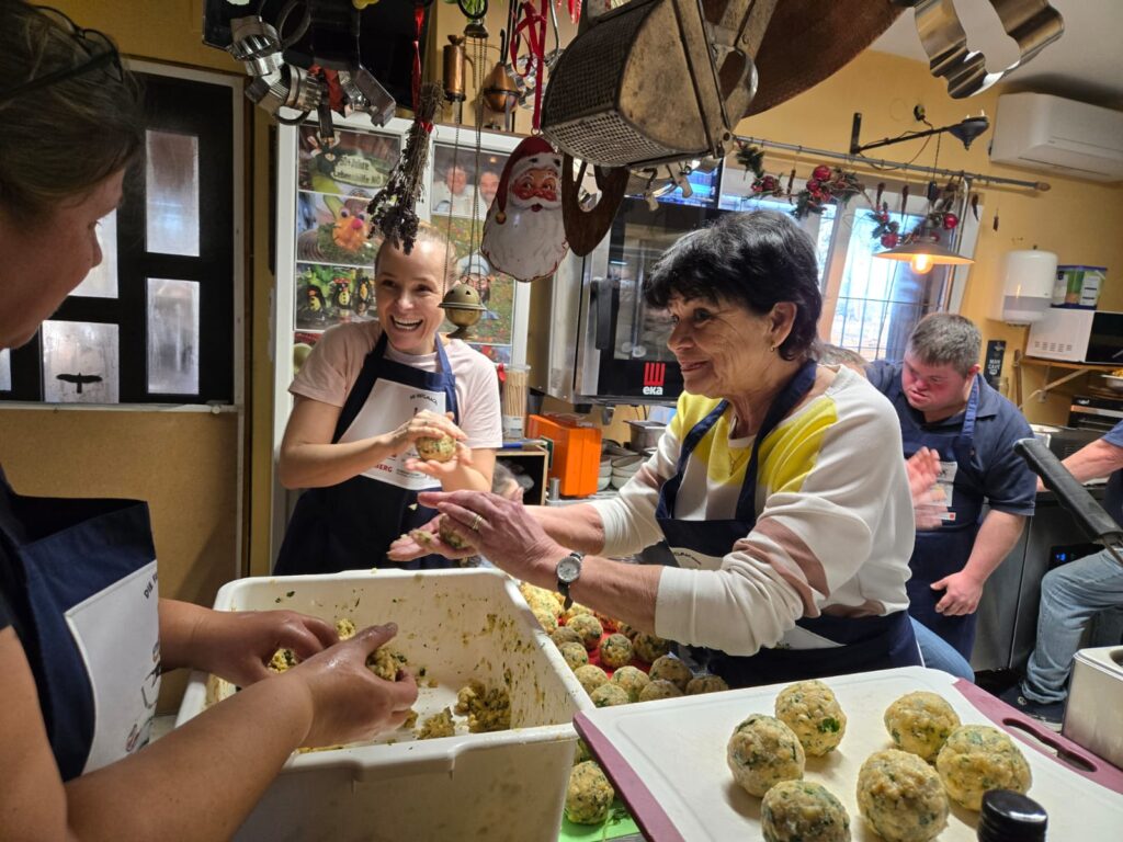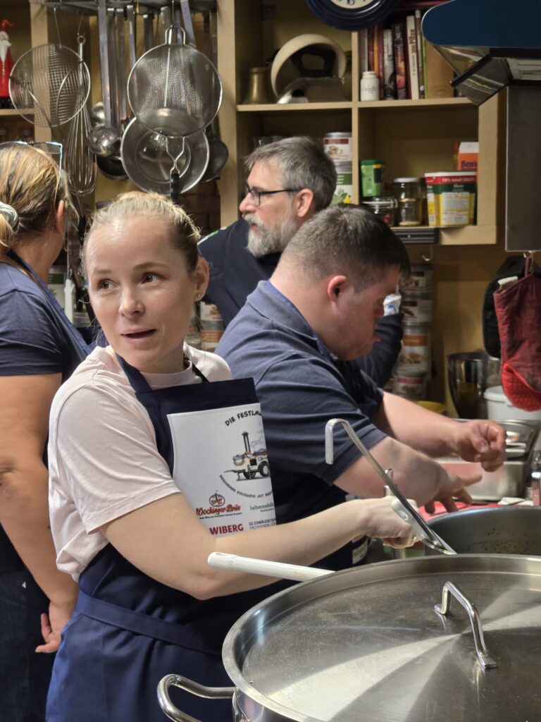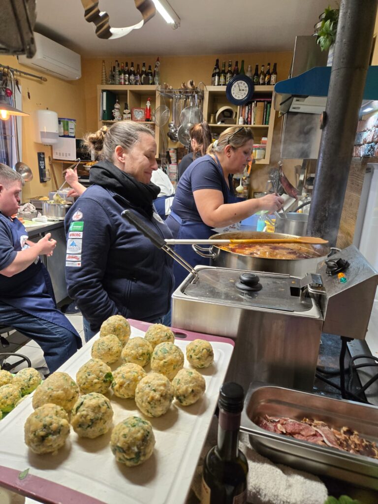 Während das Gulasch gemütlich vor sich hin blubberte, stand das gemeinsame Kochen im Mittelpunkt des Vormittags. Die Festelmacher kümmerten sich mit viel Routine um die Zubereitung der Semmelknödel, damit diese besonders flaumig und geschmackvoll gelingen. Als Nachspeise warteten gebackene Apfelspalten mit Vanilleeis, die schon beim Gedanken daran für glänzende Augen sorgten.